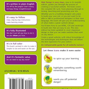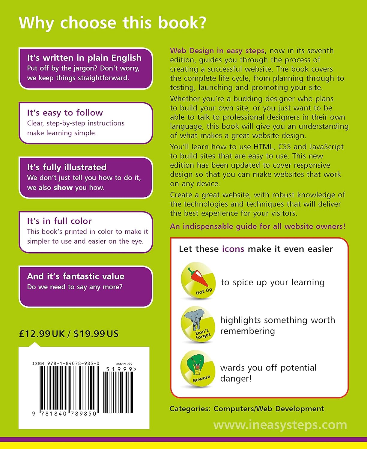 Web Design in easy steps, 7th edition reveals the key principles of good web design, which is the art and science of building effective and attractive websites. The book will introduce you to the key technologies of the web, and the design principles that underpin successful sites.